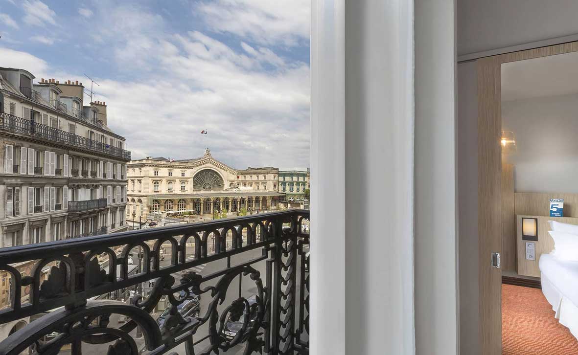 Facing Gare de l'Est, 5 minutes walk from Gare du Nord (Eurostar).